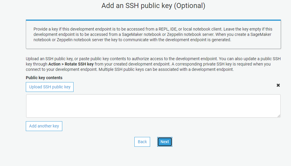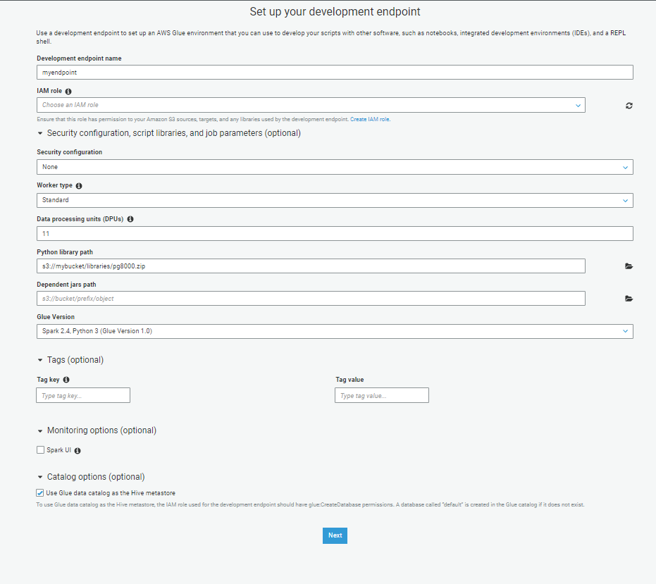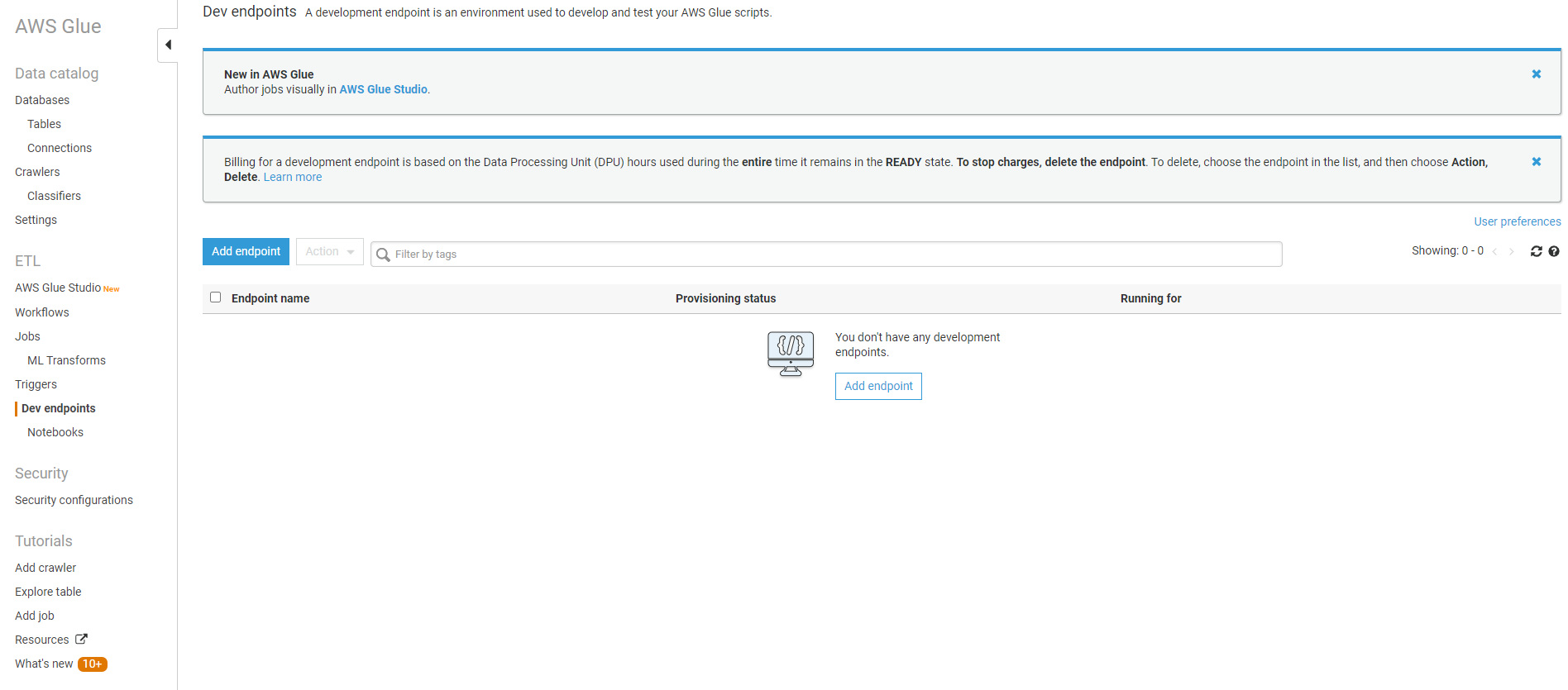 Caution: AWS Glue is expensive and so is using development endpoints. But development endpoints are a necessary evil. Just make sure that you delete the endpoint when you wrap up your day. When you start again, follow the steps again to create a fresh endpoint. You can reuse the key pairs every day. The process of deleting and re-creating an endpoint may seem cumbersome at first but will soon become habitual and save you precious rupees.