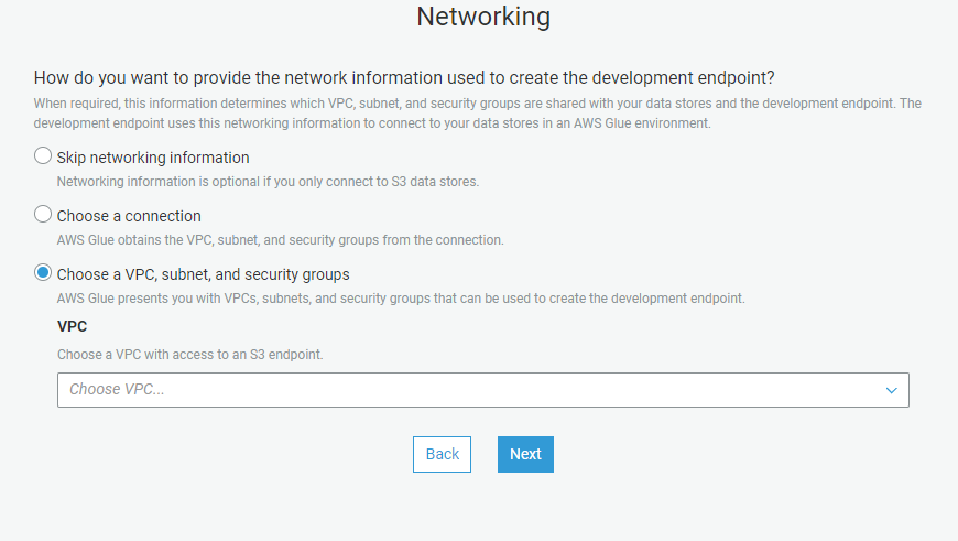 Step 1: Click “Dev endpoints” on the left menu and then click “Add Endpoint”