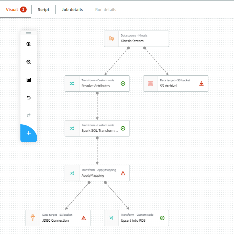 The graph provides a visual representation of your job, with nodes for each task. A data source node reads in the data. A transform node implements modifications to the dataset. A data target node writes the transformed dataset. Use the floating toolbar to manipulate the graph. This toolbar helps you to: - Zoom in and zoom out - Undo and redo changes made to the graph - Add and remove nodes When you choose a node in the graph, the right-side panel changes to display three tabs: Node properties, Output schema, and a third panel which changes, depending on the type of node. It can be Data source properties, Transform, or Data target properties. At the top of the graph, there are also tabs. - The Visual tab is the starting point for creating and editing jobs. - The Script tab allows you to view the generated script. - The Job details tab is where you provide information about the job, the environment in which the job runs, and other properties of the job. - The Run details tab is where you view the recent job runs for this particular job.